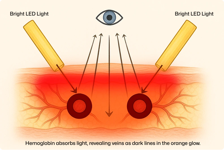 Veinlite uses high-intensity LED light to illuminate tissue from below. Blood absorbs this light, making veins appear as dark lines within the illuminated area.