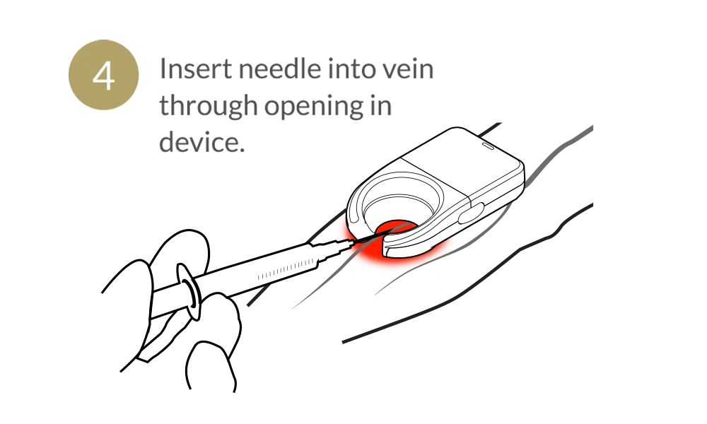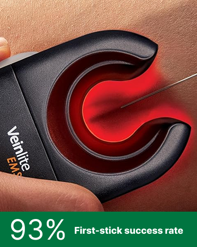 Under 30 seconds for most clinicians. There's no training required. The process is intuitive: 1. Turn on the device 2. Place it against skin perpendicular to the vein direction 3. Veins appear immediately as dark lines 4. Rotate 90° parallel to the vein 5. Insert needle through the device opening If you can start an IV, you can use Veinlite. Unlike near-infrared devices that require calibration, positioning, and interpretation training, Veinlite works immediately out of the box.